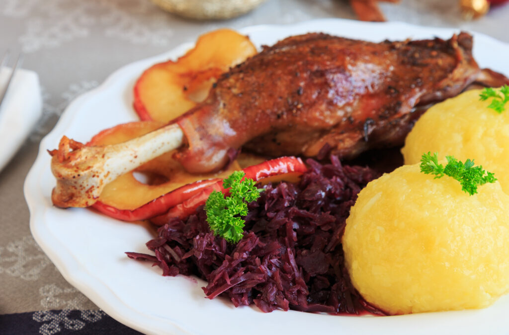 - Geschmorte Gänsebrustauf Maronensauce, gefüllter Bratapfel, dazu deftig gefüllte Kartoffelklöße und Apfelrotkohl