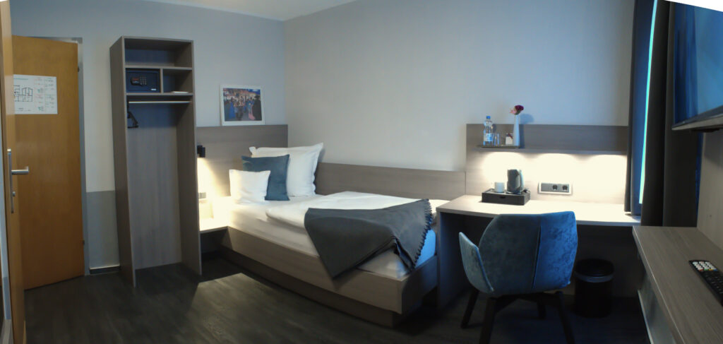 Unsere Klassik-Zimmer sind ideal für Geschäftsreisende und Gäste, die Wert auf ein angenehmes Raumgefühl und eine solide Ausstattung legen. Mit gemütlichem Bett, Schreibtisch, kostenfreiem WLAN und TV bieten sie alles für einen entspannten Aufenthalt in Leverkusen.